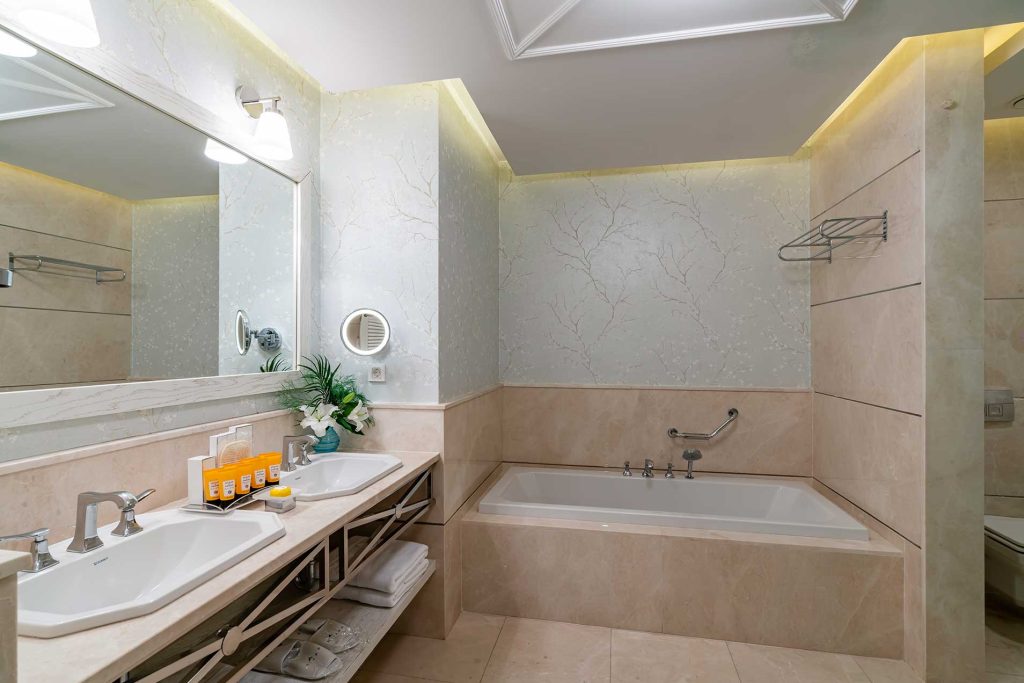 Our 90 m² Land or Sea view Rooms with your own private terrace, room includes dressing room, 1 king size and twin beds in two rooms or 2 king size beds in two rooms, work table, LCD TV, satellite broadcasting, musical broadcasting from TV, minibar, telephone, air-cooling system, electronic safe, balcony, carpet, bathroom with shower and WC, hairdryer, bathrobe, slippers.
